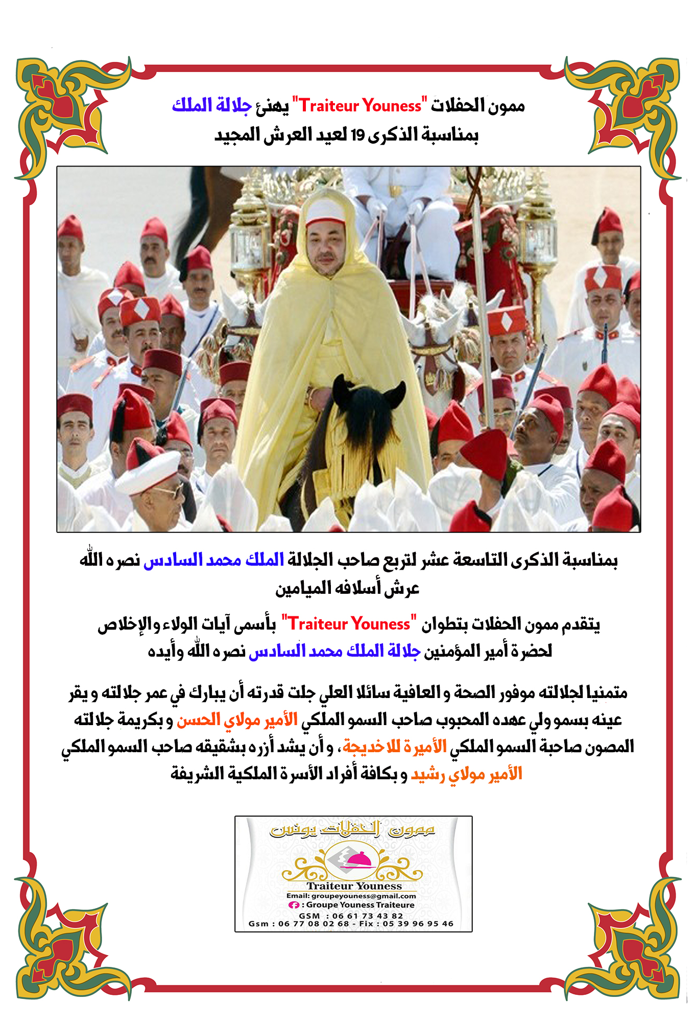 ممون الحفلات “Traiteur Youness” يهنئ جلالة الملك بمناسبة الذكرى 19 لعيد العرش محلية On يوليو 29, 2018 انشر