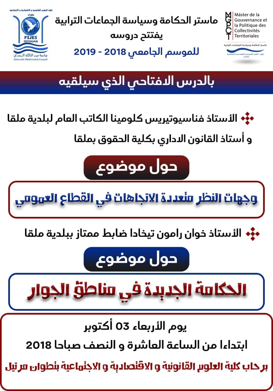 ينظم ماستر الحكامة وسياسة الجماعات الترابية بكلية العلوم الاقتصادية والقانونية والاجتماعية لتطوان، الدروس الافتتاحي للموسم الجامعي 2018-2019، وذلك يوم الأربعاء 3 أكتوبر 2018 ابتداء من الساعة 10:30 صباحا.