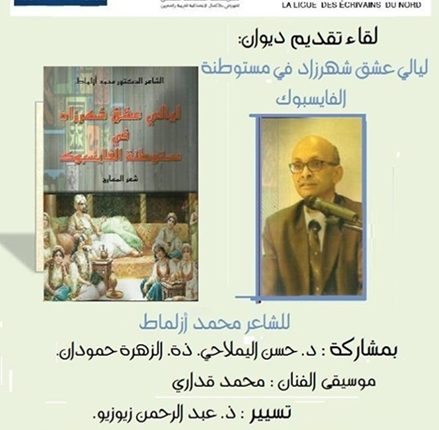 تنظم رابطة أدباء الشمال لقاء حول تقديم ديوان: “ليالي عشق شهرزاد في مستوطنة الفايسبوك” للشاعر محمد أزلماط، بمشاركة: د. حسن اليملاحي؛ ذة. الزهرة حمودان؛ ذ. عبد الرحمن زيوزيو وتسيير: د. محسن أخريف. وذلك يوم الخميس 22 نونبر على الساعة السادسة مساء بالمركز السوسي ثقافي محمد السادس بتطوان.
