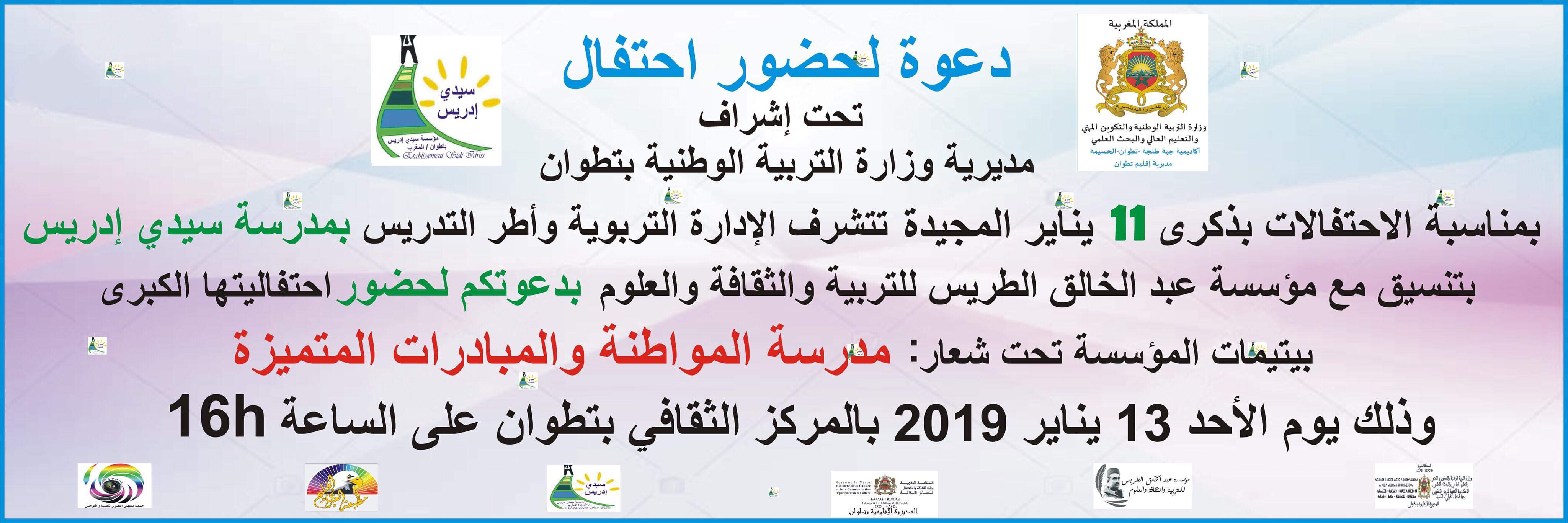 بمناسبة الاحتفالات بذكرى تقديم وثيقة المطالبة بالاستقلال، التي تصادف يوم 11 يناير من كل سنة، تنظم مدرسة سيدي ادريس للتعليم الإبتدائي، بتنسيق مع مؤسسة عبد الخالق الطريس للتربية والثقافة والعلوم، وتحت إشراف مديرية وزارة التربية الوطنية بتطوان، احتفالات كبرى بيتيمات المؤسسة تحت شعار “مدرسة المواطنة والمبادرات المتميزة”، وذلك يوم الأحد 13 يناير 2019 على الساعة الرابعة زوالا بالمركز الثقافي بتطوان.