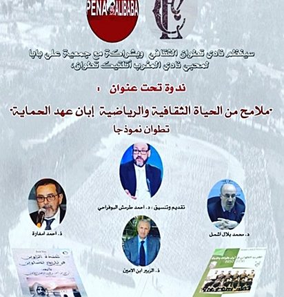 تطوان.. ندوة حول الرياضة بشمال المغرب ابان عهد الحماية “تطوان نموذجا” تحت المجهر رياضة محلية On أكتوبر 8, 2019 انشر ينظم نادي تطوان الثقافي ندوة تحت عنوان”ملامح من الحياة الثقافية والرياضية بشمال المغرب إبان عهد الحماية-تطوان نموذجا-“وذلك يوم الجمعة 18 أكتوبر2019 بقاعة العروض التابعة للنادي الكائن بشارع محمد الخامس على الساعة 16.30عصرا. الدعوة عامة
