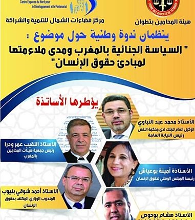 تنظم هيئة المحامين بتطوان ومركز فضاءات الشمال للتنمية والشراكة ندوة وطنية حول موضوع “السياسة الجنائية بالمغرب وملاءمتها لمبادئ حقوق الإنسان”، التي ستحتضن أشغالها قاعة الندوات الكبرى برئاسة جامعة عبد المالك السعدي بتطوان يوم الجمعة 18 أكتوبر على الساعة الثالثة بعد الزوال.