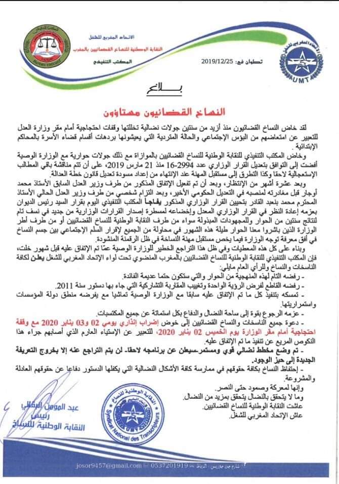 قررت النقابة الوطنية للنساخ القضائيين بالمغرب المنضوية تحت لواء الاتحاد المغربي للشغل، خوض إضراب وطني يومي 02 – 03   يناير 2020 بجميع محاكم المملكة، وسيتخلل هذا الاضراب وقفة احتجاجية امام مقر وزارة العدل يوم الخميس 02 يناير 2020 على الساعة 11 صباحا.