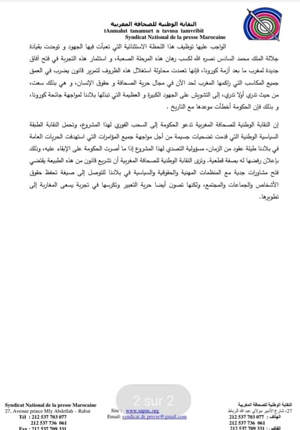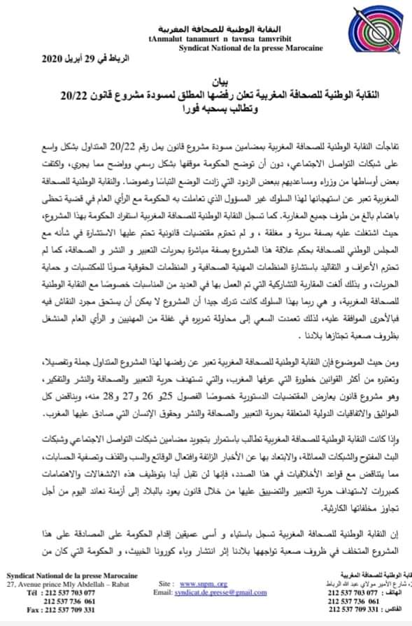 بيان.. النقابة والوطنية للصحافة المغربية تعلن رفضها المطلق لمسودة مشروع قانون 22.20 وتطالب فورا بسحبه أخبار دوليةأخبار وطنية Last updated أبريل 29, 2020 انشر