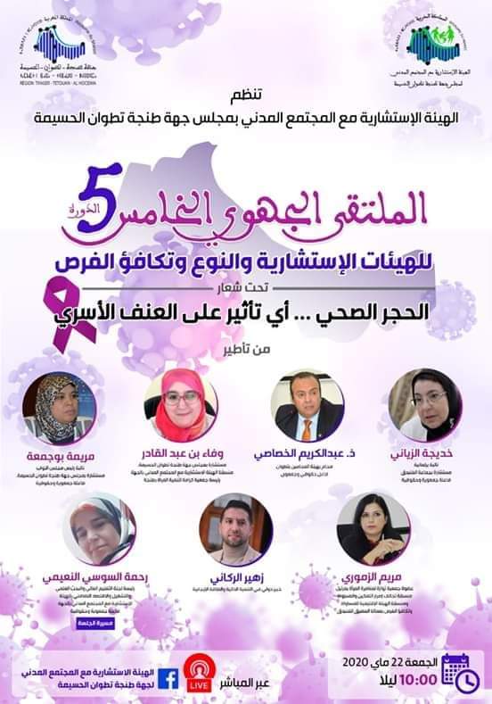 تنظم الهيئة الإستشارية مع المجتمع المدني بمجلس جهة طنجة تطوان، ندوة عبر المباشر، في إطار مقاربة النوع وتكافؤ الفرص ومحاربة جميع أنواع العنف الأسري والتحسيس بأهمية الحوار والإنصات إلى الآخر، من خلال نقاش معمق لطرح الإشكالات وتقديم الحلول، تحت شعار: “الحجر الصحي… أي تأثير على العنف الأسري”، من تأطير ثلة من الفاعلين، وذلك يوم الجمعة 23 ماي 2020 على الساعة العاشرة ليلا.