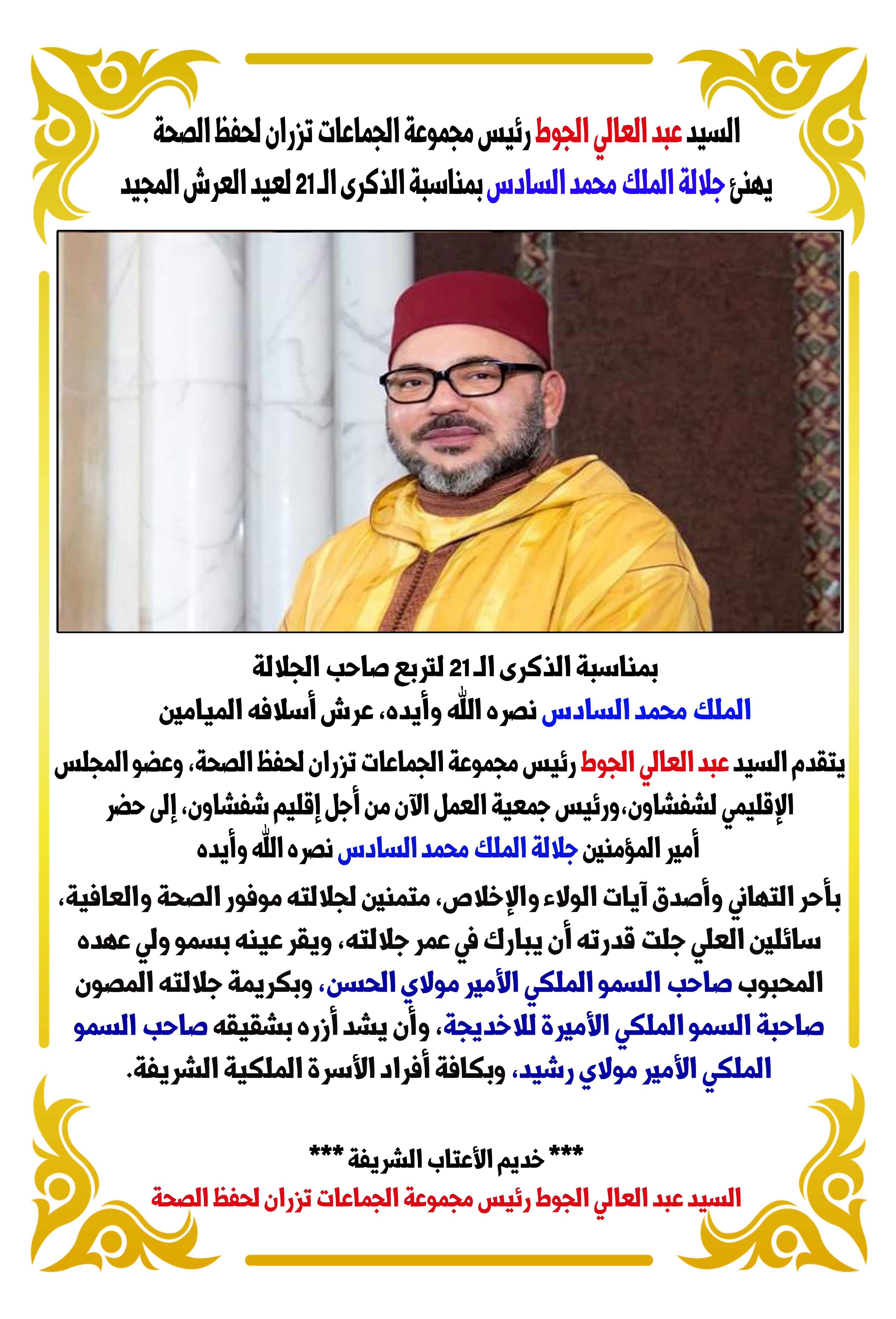 السيد عبد العالي الجوط رئيس مجموعة الجماعات لحفظ الصحة تزيران يهنئ جلالة الملك محمد السادس بمناسبة الذكرى الـ 21 لعيد العرش المجيد محلية Last updated أغسطس 4, 2020 انشر