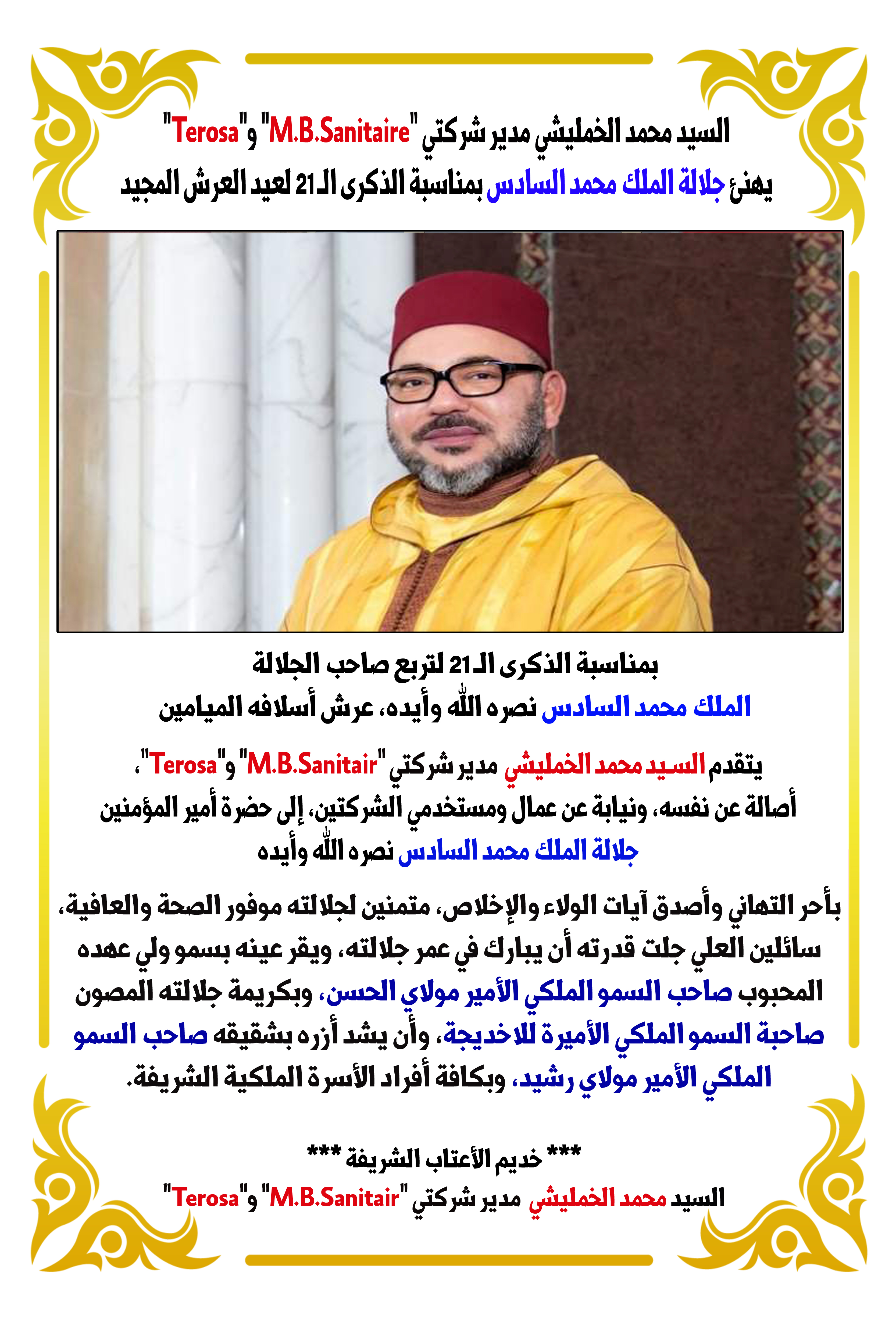 السيد محمد الخمليشي مدير شركتي “Terosa” و”M.B.Sanitaire” يهنئ جلالة الملك بمناسبة الذكرى الـ 21 لعيد العرش محلية Last updated يوليو 28, 2020 انشر
