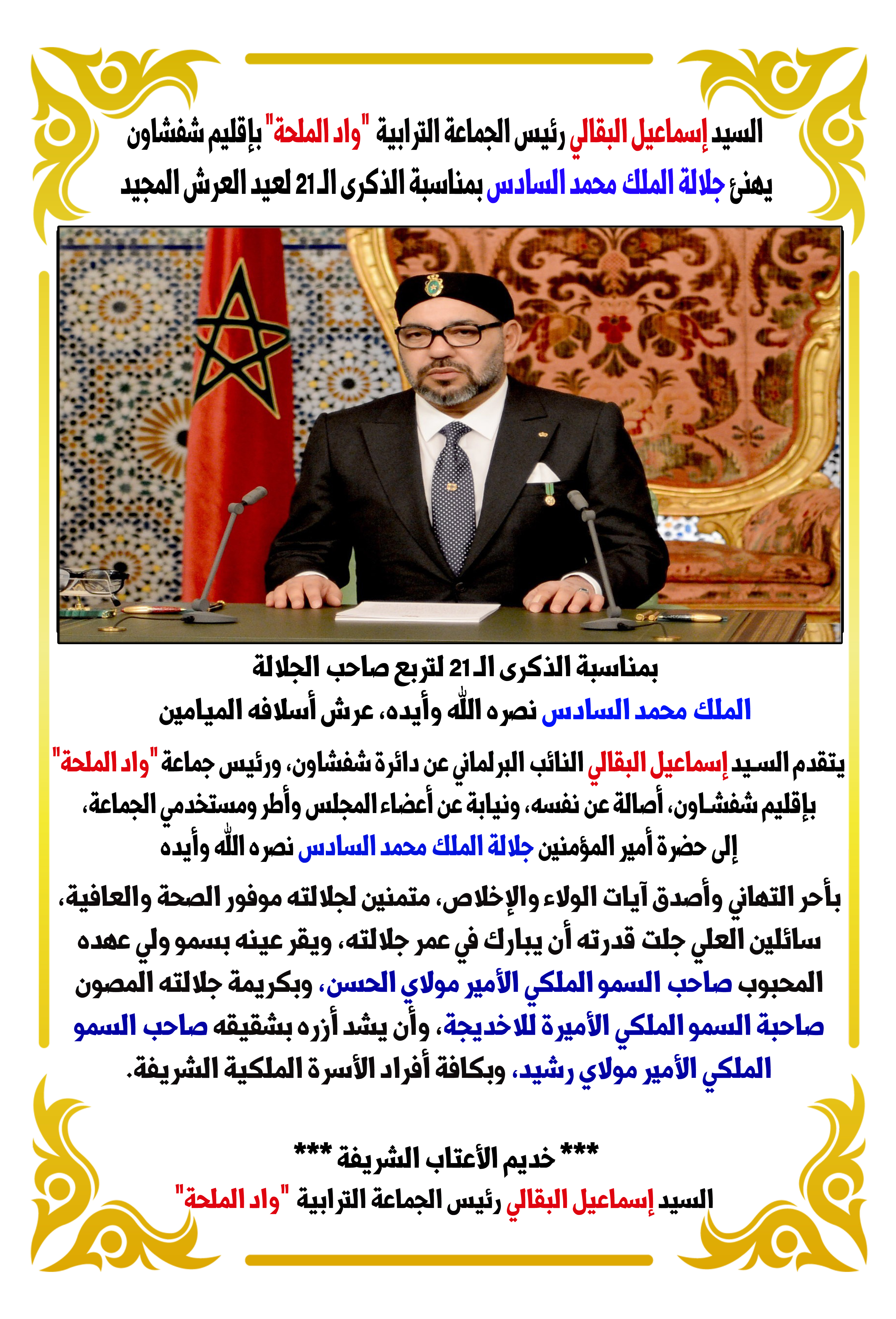 السيد إسماعيل البقالي رئيس جماعة “واد ملحة” يهنئ جلالة الملك بمناسبة ذكرى الـ 21 لعيد العرش المجيد محلية Last updated يوليو 28, 2020 انشر
