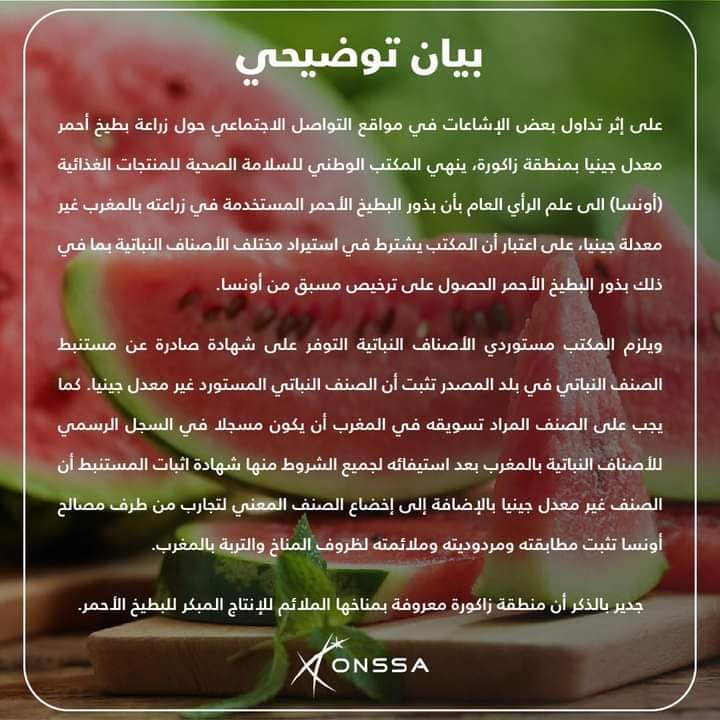 وأوضحت “ONSSA”، في بيان توضيحي نشرته عبر صفحتها الرسمية بـ”الفايسبوك”، بأن بذور البطيخ الأحمر المستخدمة في زراعته بالمغرب غير معدلة جينيا، على اعتبار أن المكتب يشترط في استيراد مختلف الأصناف النباتية، بما في ذلك بذور البطيخ الأحمر، الحصول على ترخيص مسبق من “أونسا”.