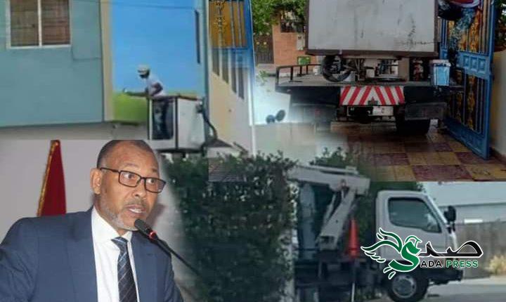 وحصل موقع جريدة “صدى تطوان”على صور تظهر خلاله شاحنة برافعة تحمل ترقيم “ج” تابعة للجماعة عشية يوم السبت 3 يوليوز الجاري وهي تستخدم تبليط جدران مدرسة خصوصية (م،ع) بحي عين ملول بتطوان في ملكية أحد المقربين من الرئيس والمنتمين لحزب العدالة والتنمية ما يؤكد وجود شبهة استغلال ممتلكات الجماعة لخدمة مصلحة شخصية لا علاقة لها بالمصلحة العامة.