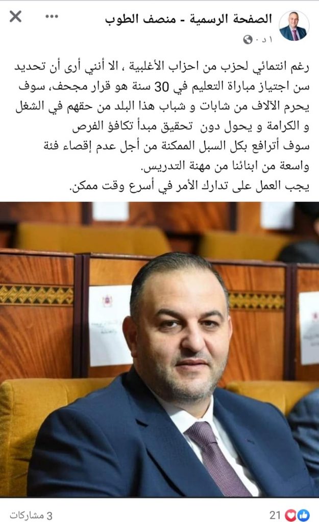 وكتب البرلماني منصف الطوب عبر صفحته الشخصية بموقع فيسبوك “رغم انتمائي لحزب من احزاب الأغلبية ، إلا أنني أرى أن تحديد سن اجتياز مباراة التعليم في 30 سنة هو قرار مجحف، سوف يحرم الآلاف من شابات و شباب هذا البلد من حقهم في الشغل و الكرامة و يحول دون تحقيق مبدأ تكافؤ الفرص”