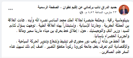 تقدم حميد الدراق نائب برلماني عن إقليم تطوان، بسؤال كتابيا لوزير النقل واللوجيستيك، حول دراسة مقترح خلق خط بحري يربط ميناء مارينا سمير ومالڤا ، والجزيرة الخضراء بإسبانيا.”.