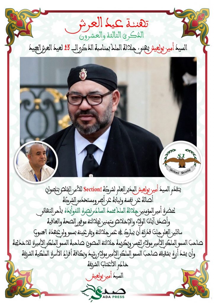 السيد “أمين بولعيش” المدير العام لشركة “Section1” للأمن الخاص يهنئ جلالة الملك بمناسبة الذكرى 23 لعيد العرش أخبارجهوية Last updated يوليو 31, 2022 انشر