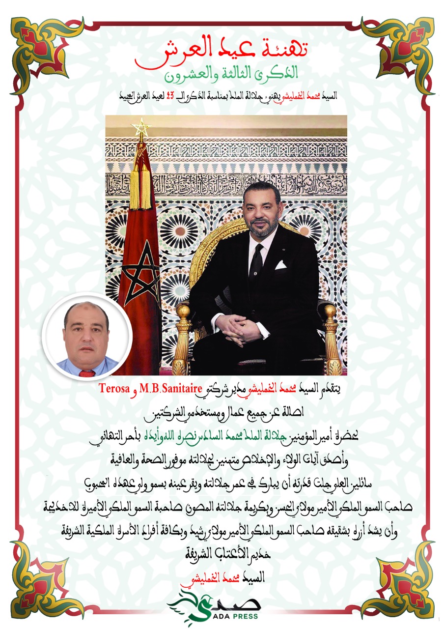 السيد محمد الخمليشي مدير شركتي “Terosa” و”M.B.Sanitaire” يهنئ جلالة الملك بمناسبة الذكرى 23 لعيد العرش المجيد محلية On يوليو 30, 2022 انشر