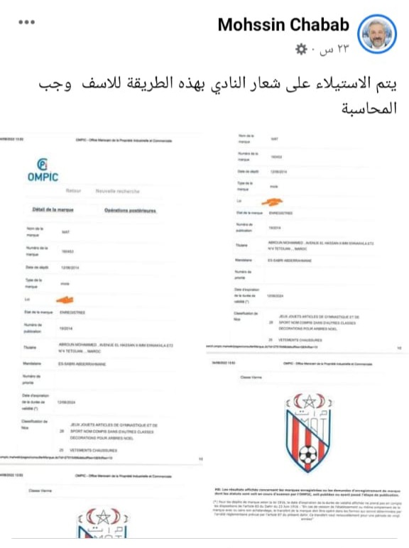 فجر محسن الشباب، النائب الجماعي والمنخرط بنادي المغرب التطواني والمتتبع لشؤون كرة القدم بالمدينة، مفاجأة من العيار الثقيل. فحسب ما نشره في إحدى الصفحات الإلكترونية بالفايسبوك مؤخرا، فإن اسم وشعار فريق المغرب التطواني في السنوات الأخيرة مسجلين لدى المكتب المغربي للملكية الصناعية والتجارية بإسم محمد أشرف أبرون منذ 12 يونيو من سنة 2014 (بصلاحية تمتد إلى غاية سنة 2024). والشعار مسجل كلوغو لعلامة MAT المتخصصة في مجال “اللعب وآلات الجمباز والرياضة بما فيها مواد تزيين أشجار أعياد ميلاد المسيح”… (وما علاقة هذا بكرة القدم؟)