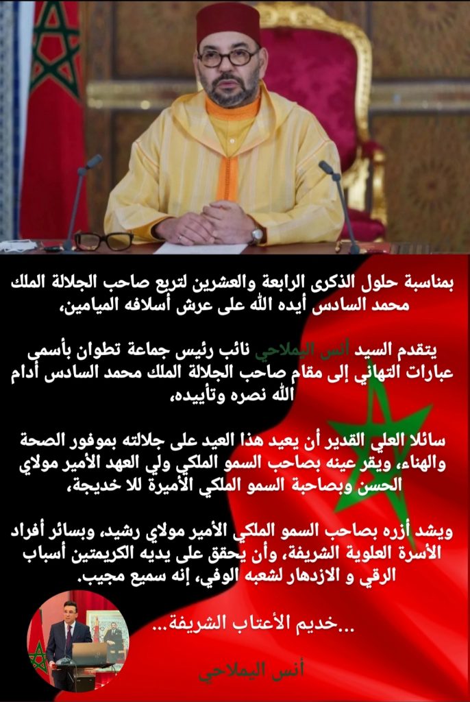 أنس اليملاحي نائب رئيس جماعة تطوان يهنئ جلالة الملك بمناسبة الذكرى 24 لعيد العرش المجيد أخبارأخبار وطنيةتهنئة Last updated يوليو 28, 2023 انشر تهنئة مرفوعة إلى حضرة صاحب الجلالة الملك محمد السادس نصره الله بمناسبة عيد العرش المجيد”أنس اليملاحي”