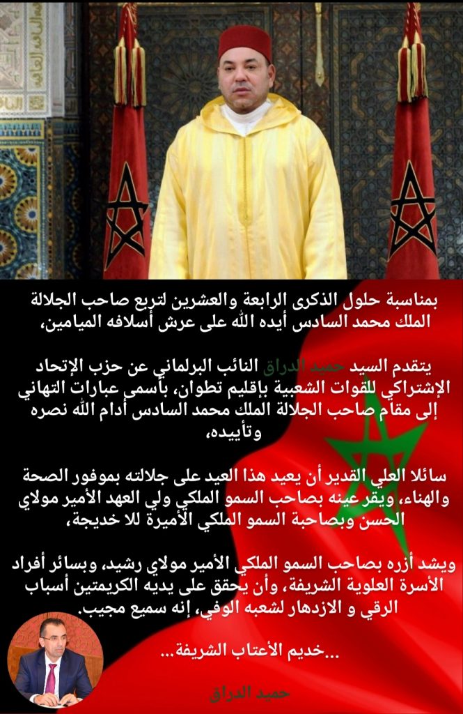 تهنئة مرفوعة إلى حضرة صاحب الجلالة الملك محمد السادس نصره الله بمناسبة عيد العرش المجيد” حميد الدراق” أخبارأخبار وطنيةتهنئة On يوليو 28, 2023 انشر حميد الدراق النائب البرلماني عن حزب الإتحاد الاشتراكي للقوات الشعبية يهنئ جلالة الملك بمناسبة الذكرى 24 لعيد العرش المجيد .