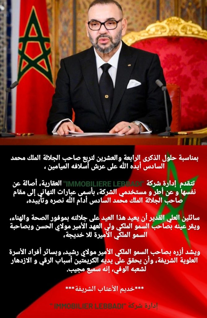 إدارة شركة “Immobilière Lebbadi” العقارية تهنئ جلالة الملك بمناسبة الذكرى 24 لعيد العرش المجيد أخبارأخبار وطنيةتهنئة Last updated يوليو 30, 2023 انشر تهنئة مرفوعة إلى حضرة صاحب الجلالة الملك محمد السادس نصره الله بمناسبة عيد العرش المجيد”Immobilière Lebbadi”