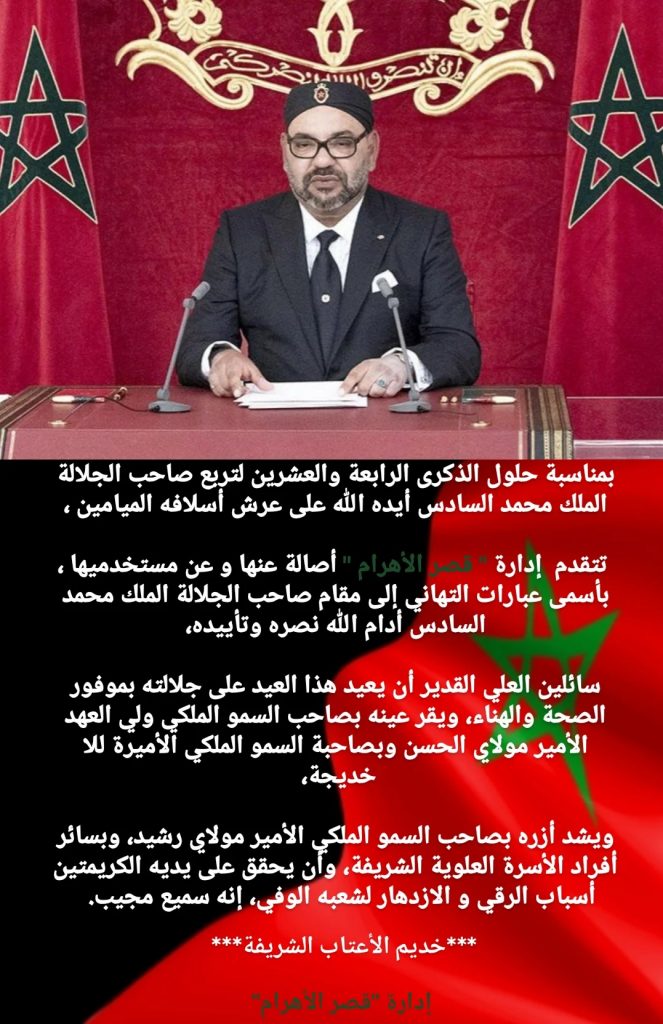إدارة ” قصر الأهرام ” تهنئ صاحب الجلالة بمناسبة الذكرى 24 لعيد العرش المجيد