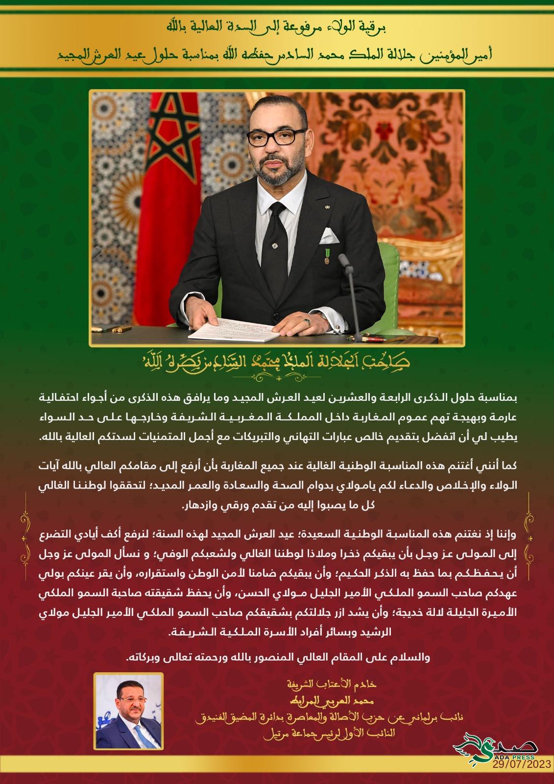 برقية ولاء وإخلاص مرفوعة للسدة العالية بالله أمير المؤمنين من البرلماني عن دائرة المضيق الفنيدق محمد العربي المرابط برقية_ولاء Sada TVأخبار Last updated يوليو 31, 2023 انشر