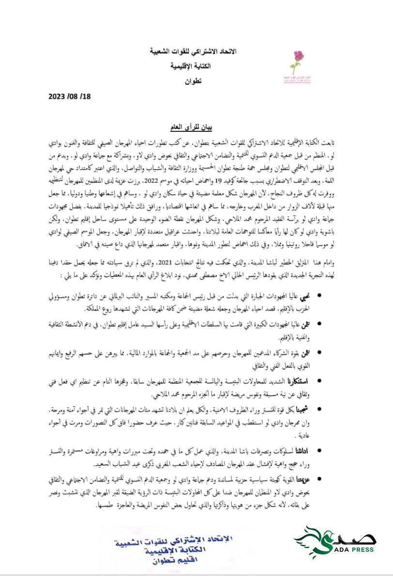 أصدرت الكتابة الإقليمية للاتحاد الاشتراكي للقوات الشعبية في تطوان بلاغا يدين منع المهرجان الصيفي للثقافة والفنون بوادي لو و المنظم من قبل جمعية الدعم النسوي للتنمية والتضامن الاجتماعي والثقافي بحوض وادي لاو، وبشراكة مع جماعة وادي لو، وبدعم من قبل المجلس الاقليمي لتطوان ومجلس جهة طنجة تطوان الحسيمة ووزارة الثقافة والشباب والتواصل .