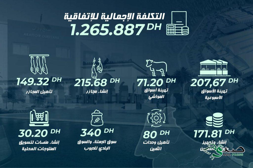 خصص لإنجاز الاتفاقية الخاصة ميزانية مهمة تقدر ب 887 265 1 ألف درهم، تم توزيعها على مختلف المشاريع الإستراتيجية، وتهم هذه المشاريع تهيئة الأسواق الأسبوعية، وتهيئة أسواق المواشي، وإنشاء وتأهيل المجازر، إضافةً إلى إنشاء وتجهيز وحدات التثمين وتأهيلها، فضلاً عن مشاريع مرتبطة بأسواق الجملة، والسوق البلدي للحبوب، وكذا إنشاء منصات لتسويق المنتجات المحلية.