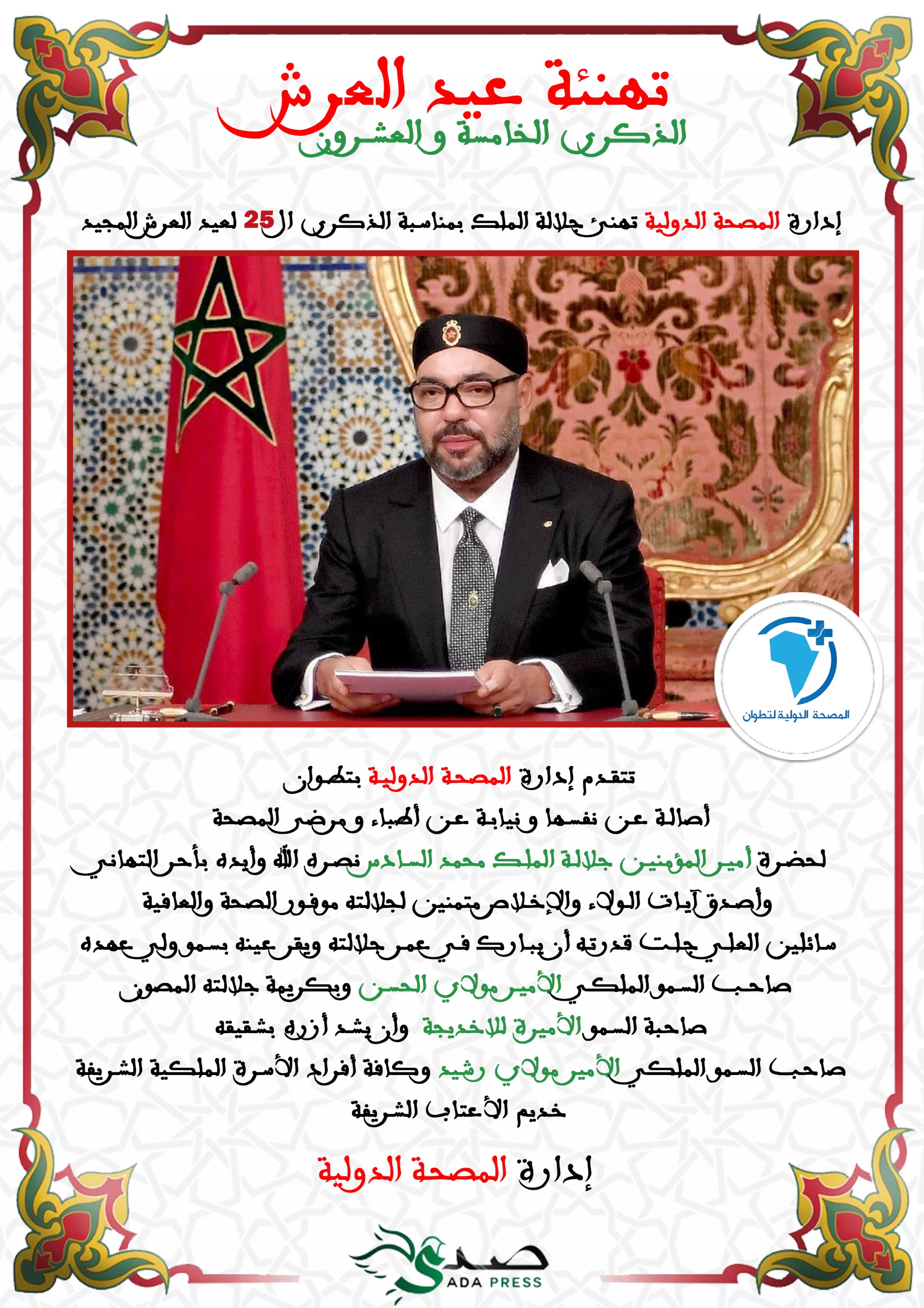 إدارة “المصحة الدولية بتطوان” تهنئ جلالة الملك بمناسبة الذكرى 25 لعيد العرش المجيد
