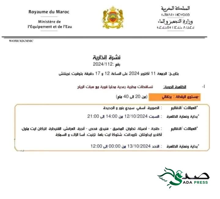 وأوضحت المديرية، في نشرة إنذارية من مستوى يقظة برتقالي، أن هذه التساقطات المطرية التي ستتراوح ما بين 20 و40 ملم، مرتقبة بكل من أقاليم الصويرة، أسفي، سيدي بنور والجديدة، من الساعة 14:00 إلى غاية الساعة 21:00 يوم السبت 12 أكتوبر 2024.