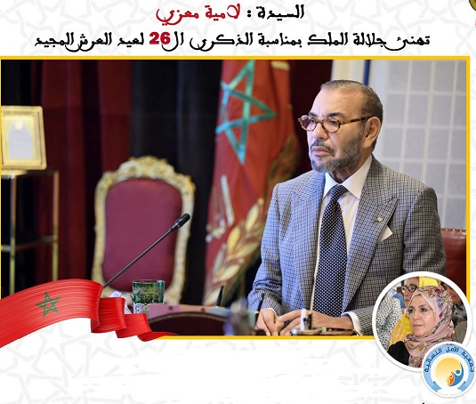 السيدة لامية معزي تهنئ جلالة الملك بمناسبة الذكرى ال 26 لعيد العرش