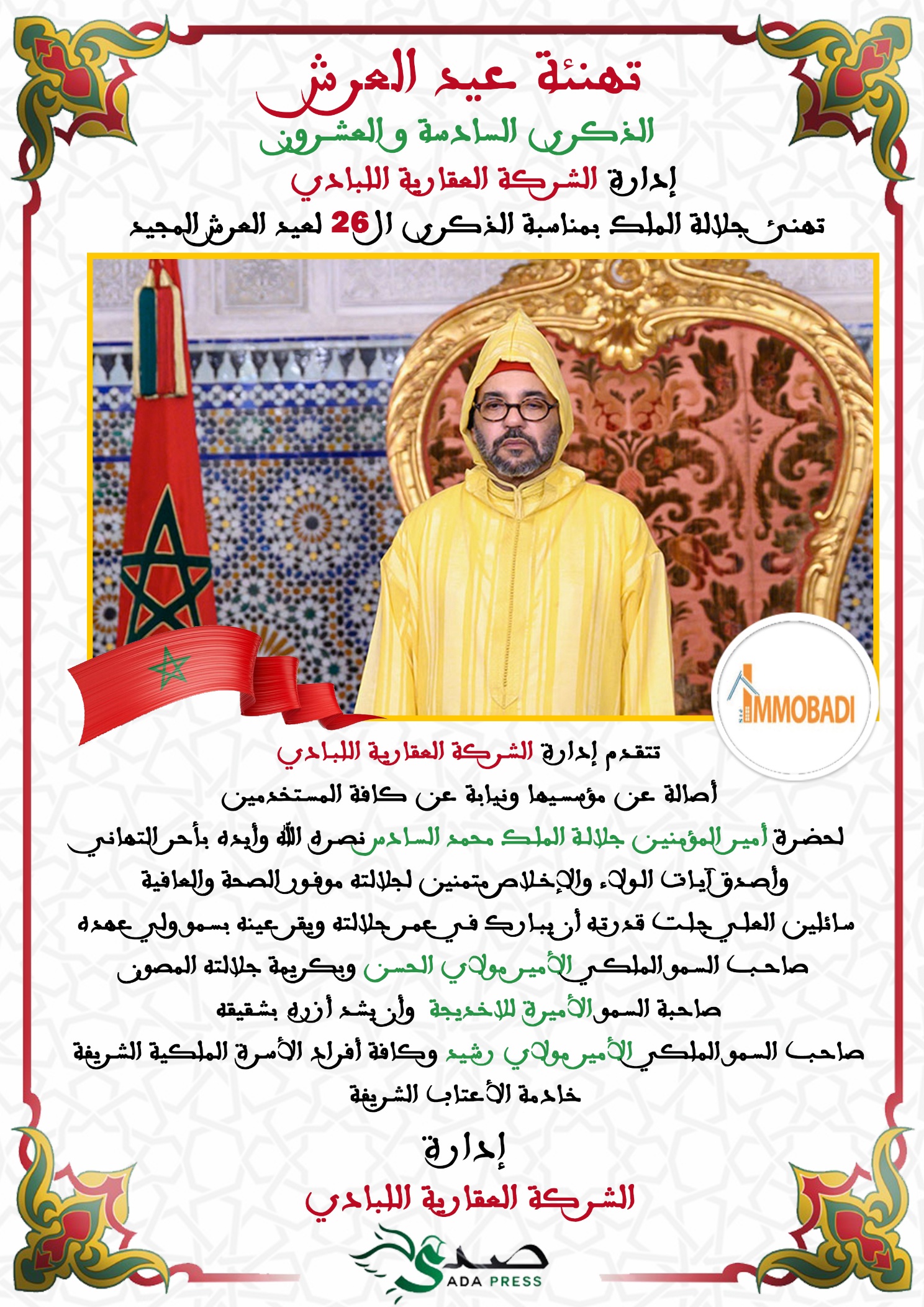 إدارة الشركة العقارية اللبادي تهنئ جلالة الملك بمناسبة الذكرى ال 26 لعيد العرش