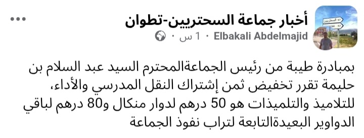 أثار إعلان عضو المجلس الجماعي بجماعة السحتريين، عبد المجيد البقالي، على جدار صفحة “أخبار جماعة السحترين-تطوان” بموقع فيسبوك، حول تخفيض سعر الاشتراك في خدمة النقل المدرسي بجماعة السحتريين بإقليم تطوان، جدلاً واسعا وتساؤلات حول دوافع هذه المبادرة. ففي الوقت الذي اعتبر فيه البعض هذا التخفيض خطوة إيجابية تصب في مصلحة التلاميذ وأولياء أمورهم، رأى آخرون أنه تحويل لملف إلى ورقة انتخابية.