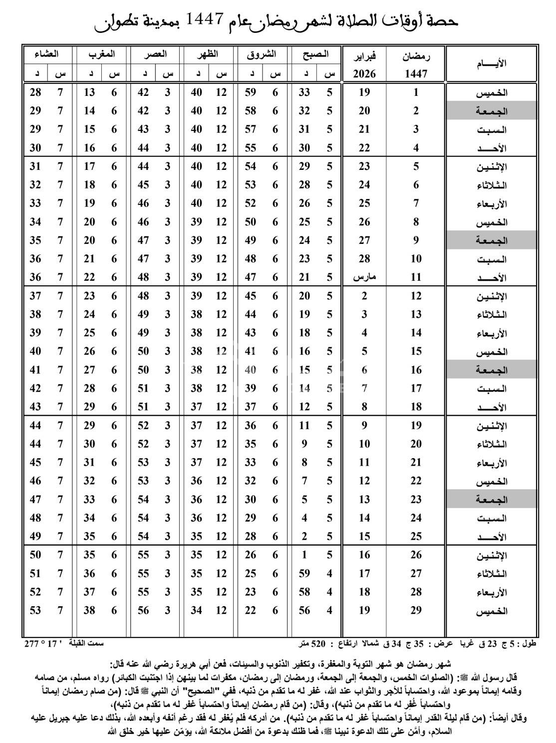 حصة أوقات الصلاة لشهر رمضان بتطوان 1447 هـ